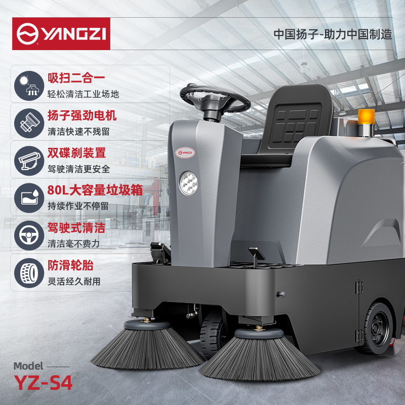 扬子扫地机YZ-S4,大型工厂清洁,力度大吸力强,扫吸洒三合一/大容量垃圾箱/液压双碟刹/扬子强劲电机/应用领域广泛/轻松爬坡