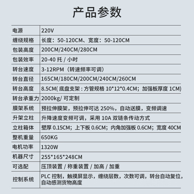 10218旭彩网智能全自动缠绕机,2吨超大承重,加厚大托盘坚固更耐用,强劲动力高效铜芯电机,数控显示屏方便调节操作简单。