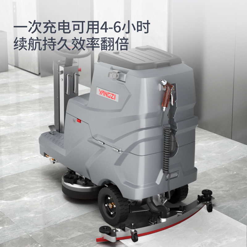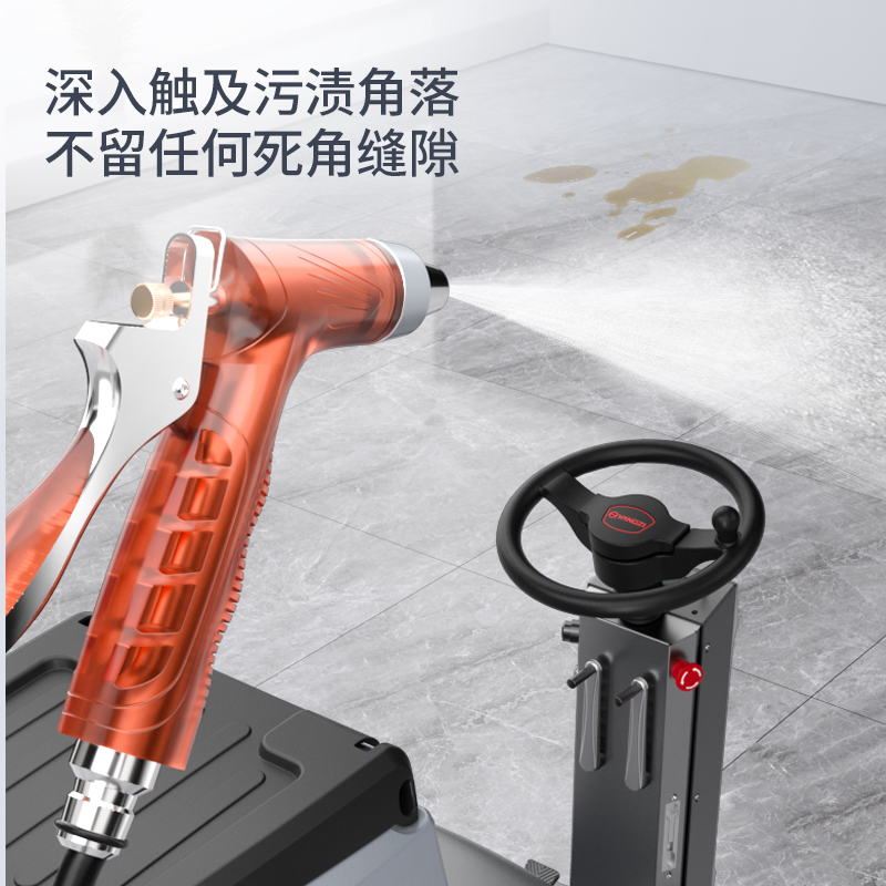 小型高效驾驶式洗地机,选配水枪驻车系统,大动力吸风电机,大容量清污水箱,品牌电池持久续航